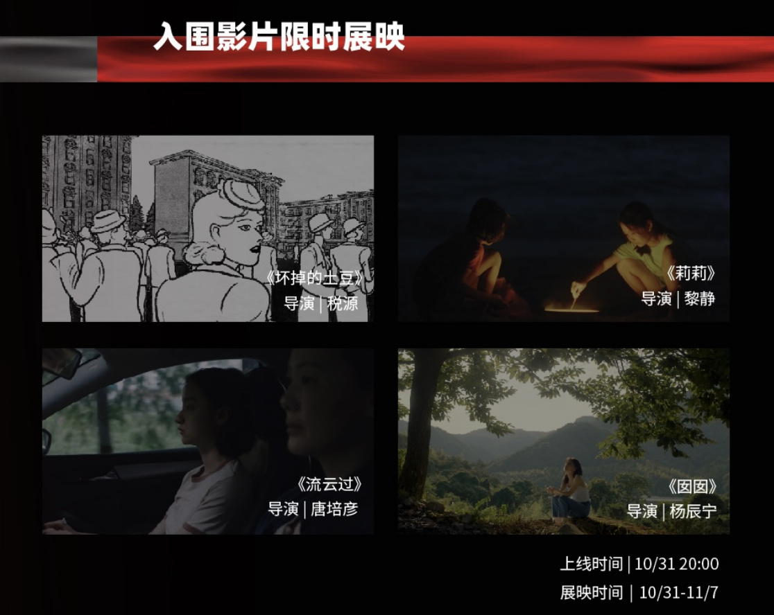 现代快报讯(记者 李艺蘅)近日,新一届FIRST青年电影展“FIRST FRAME第一帧”单元正式上线,发布了张大磊执导,周迅、王一博特别演绎的年度宣言短片《我的朋友》,并在B站同步开启了“FIRST FRAME”线上展映专区,将于10月31日——11月7日限时展映《坏掉的土豆》《莉莉》等多部入围影片。