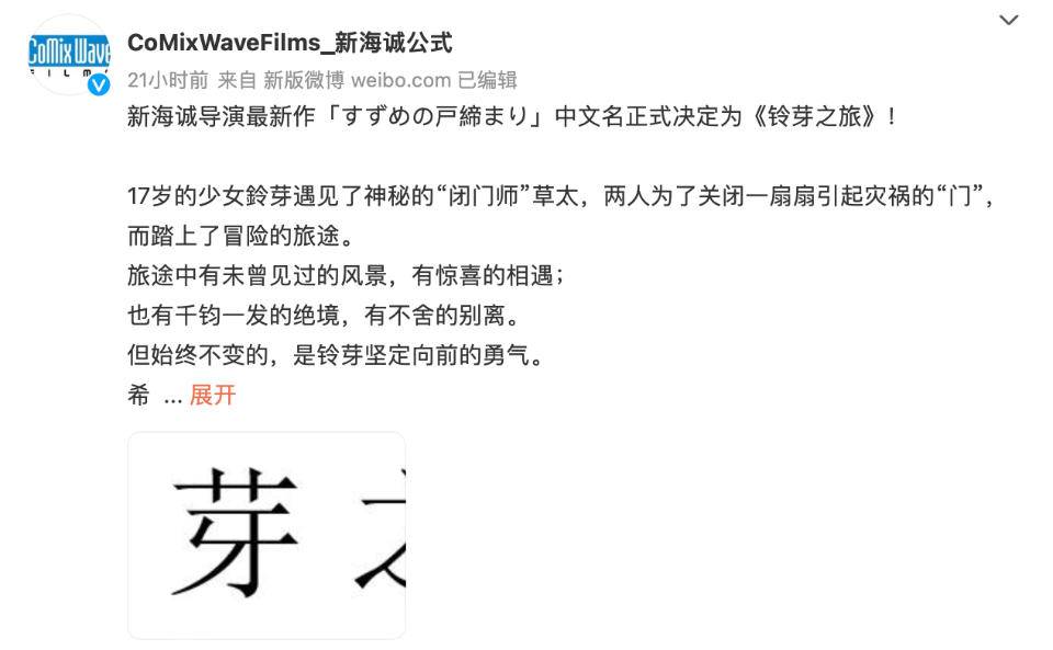 新海诚导演最新动画电影中文名正式决定为《铃芽之旅》,目前国内的具体上映日期待定。《铃芽之旅》已于11月11日在日本上映,上映24天累计票房破75亿日元,累计观影人次超560万,升至日本2022年度票房榜第四名。