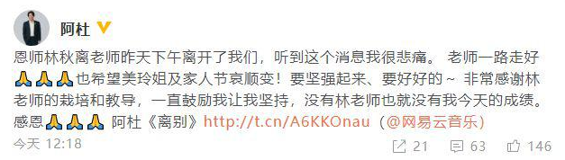 林俊杰在得知林秋离去世的消息后,通过经纪人悲恸表示:“很痛心、很不舍,音乐界失去了一位传奇作词人,而我失去了这位发掘我、一直很疼我的林秋离老师。”阿杜也在社交平台发文悼念,他写道:老师一路走好,也希望美玲姐及家人节哀顺变!要坚强起来、要好好的。非常感谢林老师的栽培和教导,一直鼓励我让我坚持,没有林老师也就没有我今天的成绩。感恩。