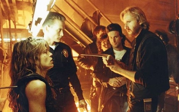 卡梅隆(图右)在《终结者2》拍摄现场。