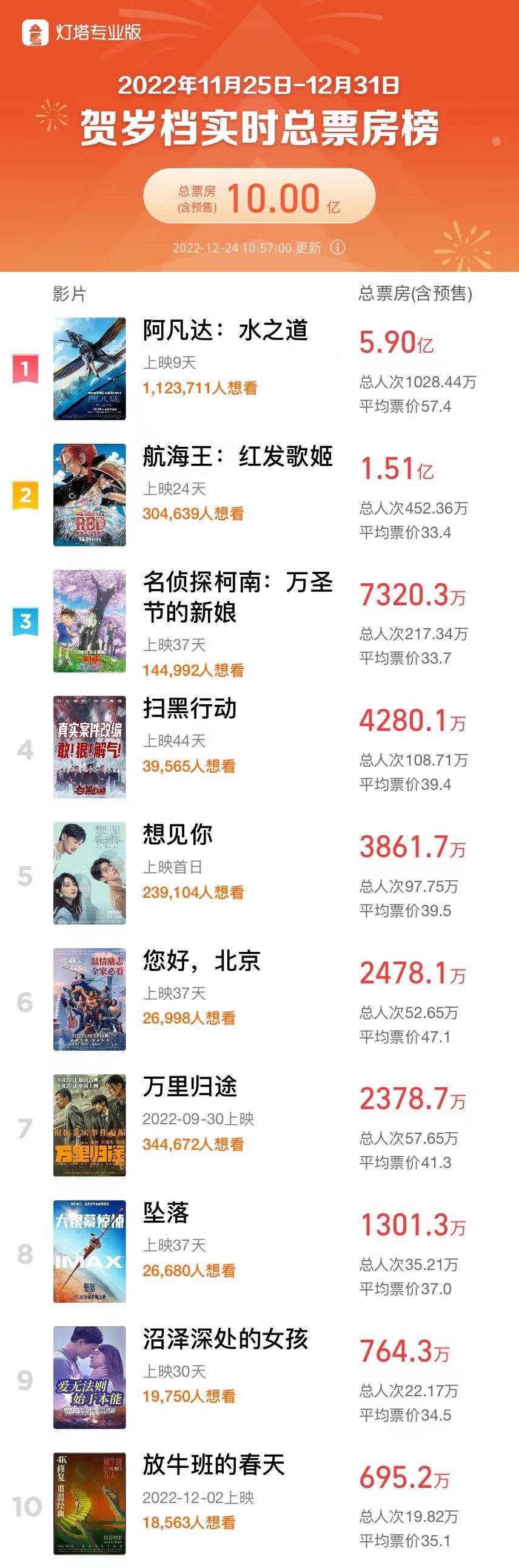 据灯塔专业版实时数据,截至12月24日10时57分,2022年贺岁档(含预售)总票房(11月25日-12月31日)突破10亿!
