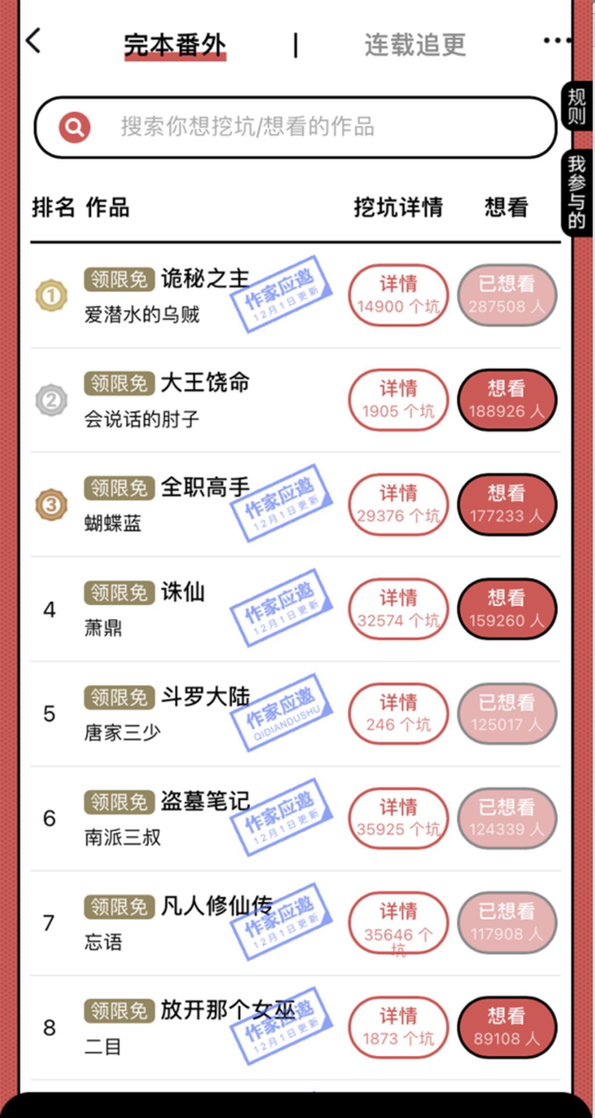 “填坑”文化在网络文学中由来已久,指更新连载,或续写小说中未交待完整的情节。此次再更新的百部作品均来源于起点用户的许愿榜单——活动前期起点读书邀请全网读者一同许愿,呼唤网文作者为完结、连载作品“填坑”,超百万用户进站投票。不少明星大咖也是网文的忠实读者,演员潘粤明、电竞解说黄旭东、触乐网创始人祝佳音等人也加入许愿行列,助阵在线喊话作者。