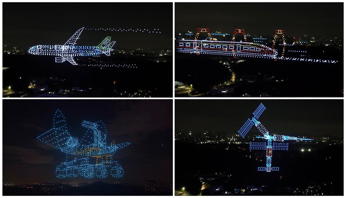 夜幕降临,视频中数千架无人机整齐摆放在广场中央。而后无人机同时闪烁,排列成四层方阵缓缓上升,随后变换阵型排列,形成惟妙惟肖的各式图案造型。