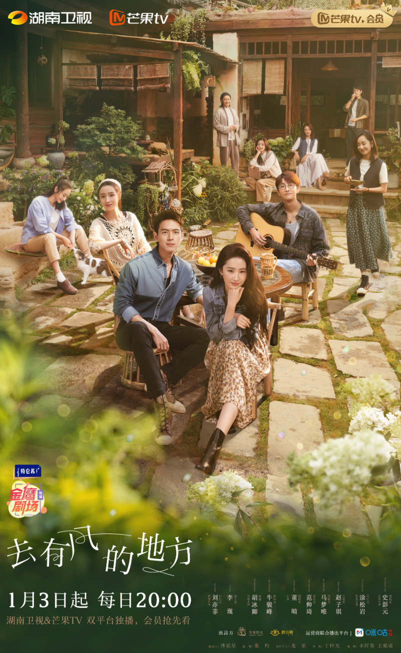 田园治愈剧《去有风的地方》讲述了辞职后来云南短住的许红豆(刘亦菲饰),意外邂逅了放弃高薪回乡兴业的谢之遥(李现饰),并在入住有风小院后,结识了带着不同经历和故事来到这里的租客们:咖啡师娜娜(胡冰卿饰)、音乐人胡有鱼(牛骏峰饰)、冷门网络作家大麦(马梦唯饰)、每天打坐饮茶的马丘山(涂松岩饰)。从陌生到熟悉,原本毫无交集的一群人,却在寻找各自人生方向的同时,为对方点燃了不期而遇的温暖,而意料之外的爱情、彼此治愈的友情也正悄然滋长……