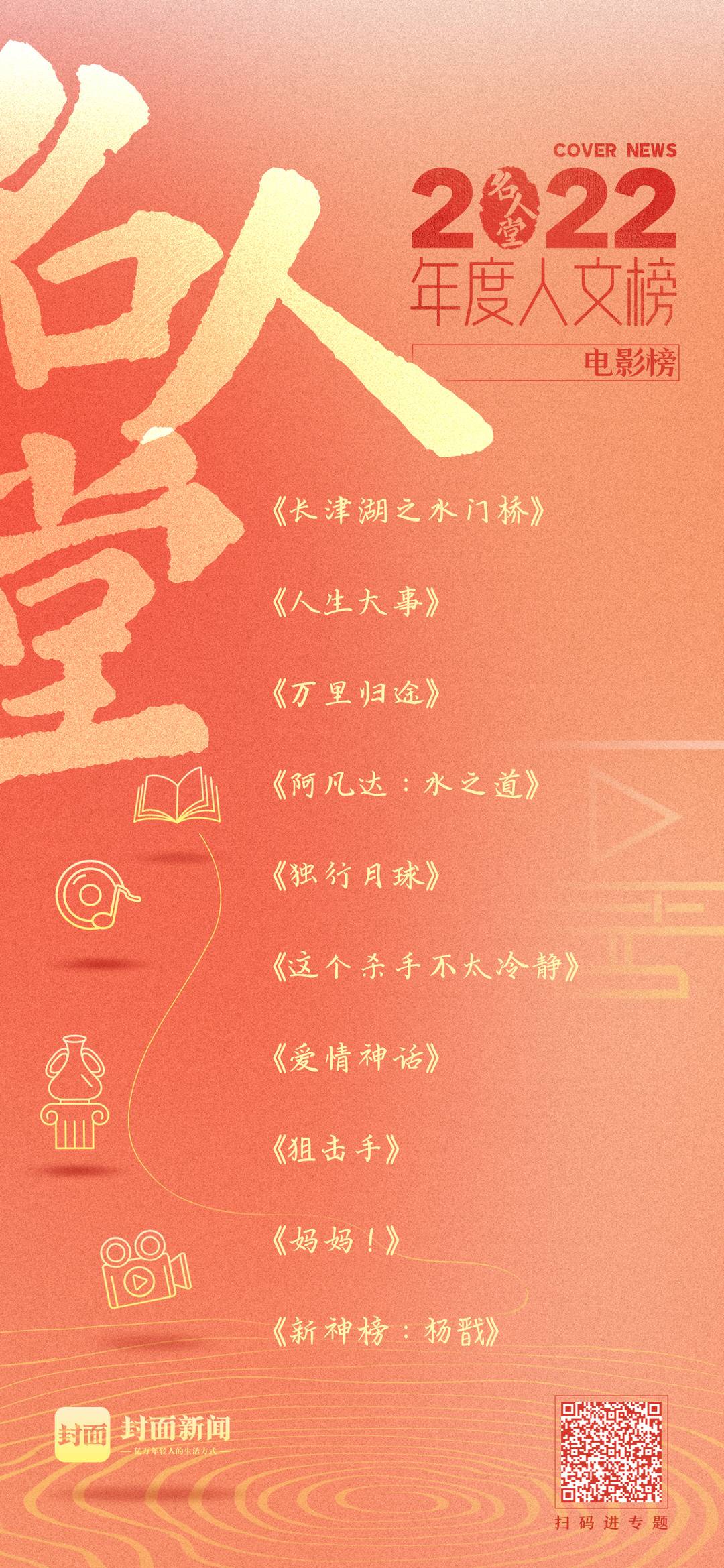 1月3日,由封面新闻、华西都市报主办的2022年名人堂年度人文榜·电影榜正式发布。该榜单主要以封面新闻客户端数据为依托,综合猫眼专业版数据、豆瓣评分为基础,同时综合全网传播热度,从用户搜索热词、浏览新闻关键词、各社交平台热度等方面,最终评选出“年度十大电影”。其中,《长津湖之水门桥》占领榜首,现实主义题材影片《人生大事》位列第二,由峨影出品的电影《万里归途》紧随其后,年末进口大片《阿凡达2》也榜上有名,这些电影都为观众提供了不同风格的观影选择。