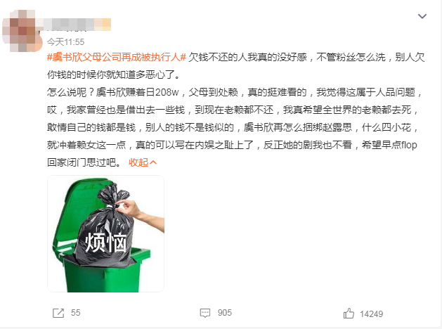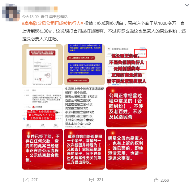 明星父母犯错,明星本人是否应该承担责任也引发了不少网友的讨论,一方面,大多数虞书欣的支持者认为在公司运营中会有买卖合同纠纷是非常常见的,不值得大惊小怪,其父母是一般生意人,不应该由此指责虞书欣本人,且在这起案件中,虞书欣父母属于受害者。但也有网友对此表示了反感,认为虞书欣作为高收入的明星,父母却被是被执行人令人难以接受。