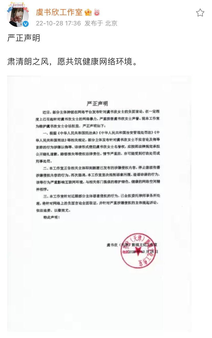 因父母公司多次陷入合同纠纷被列入被执行人,虞书欣受到部分网友指责,在2022年虞书欣及工作室进行起诉过多位网友进行名誉维权,斥责网络暴力。此前其工作室曾对相关争议进行过回应,表示“市场有风险,投资需谨慎,两家公司合作,即使再谨慎还是被别人钻了空子。”