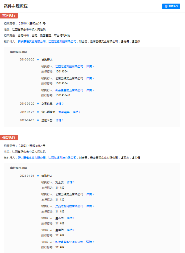 根据天眼查《中国华融资产管理股份有限公司江西省分公司与云南云镍实业有限公司,刘金美等相关合同纠纷》案由显示,在2016年江西省新余市中级人民法院对此案件进行了首次执行,相关案由为合同纠纷、合同、无因管理、不当得利纠纷,2016年6月20日新余豪誉实业执行标的15014564元,并与2022年4月25日送达公告。2023年1月4日是此案件恢复执行。该公司涉及多起买卖合同纠纷,其法定代表人刘金美曾在2020年被列为限消对象,申请人为江西蓝海国际贸易有限公司。