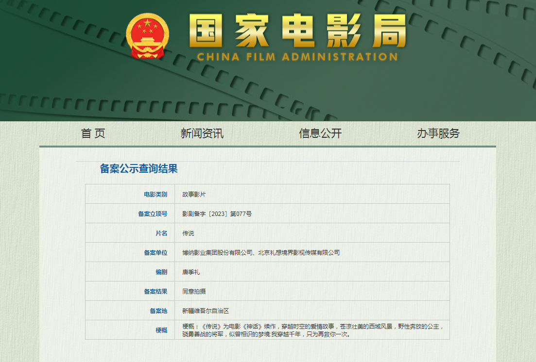 据备案公示查询结果显示,电影《神话》的续作《传说》的故事梗概为:穿越时空的爱情故事,苍凉壮美的西域风景,野性奔放的公主,骁勇善战的将军,似曾相识的梦境:我穿越千年,只为再救你一次。