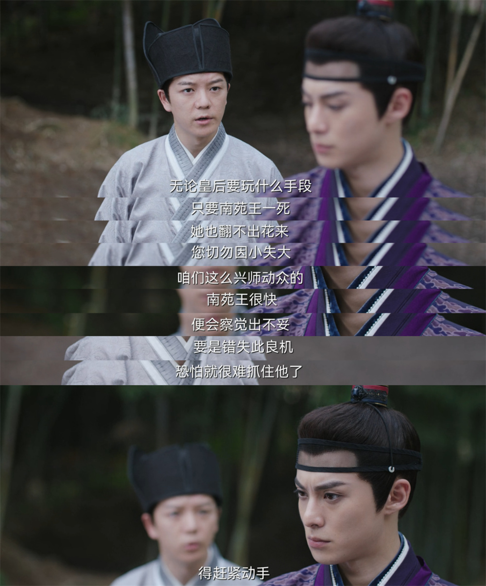就比如剧情才进行到第五集的时候,肖铎获得了一个除掉南苑王的好机会。就在这关键时刻,手下来报,福王进宫了,步音楼也消失不见。肖铎料想皇后可能在玩什么阴谋,他萌生回去救步音楼的打算。贴身太监曹春盎(王栎鑫饰)赶忙提醒他,当务之急是杀了南苑王,错过这次机会下次就难了,不要因小失大,何况斩杀了南苑王,皇后根本就不足为惧。