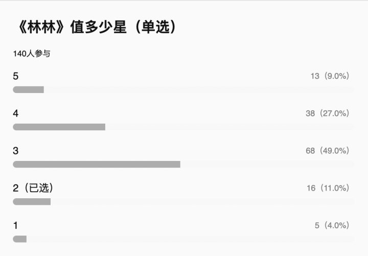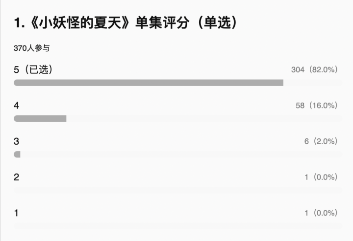 类似分集投票的链接有多个,两三百人参与的投票中,《小妖怪的夏天》的分数最好,《鹅鹅鹅》次之,《林林》大多人打三星。