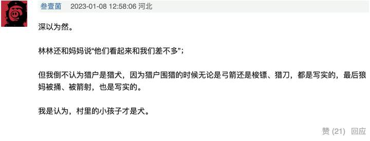 有网友解读认为,里面的猎人或作为猎人之子的“我”,实际上也不是人,而是猎狗:“个人猜测,林林和妈妈是狼,所有人类或者只有男孩和他爸应该是狗,林林因为太小了,无法分辨是狼是狗,妈妈已经长大了所以看得出是狼。”林林妈妈叮嘱林林,千万不能吃人给的东西。吃了人给的食物,被人类驯养,就变成了猎狗了。