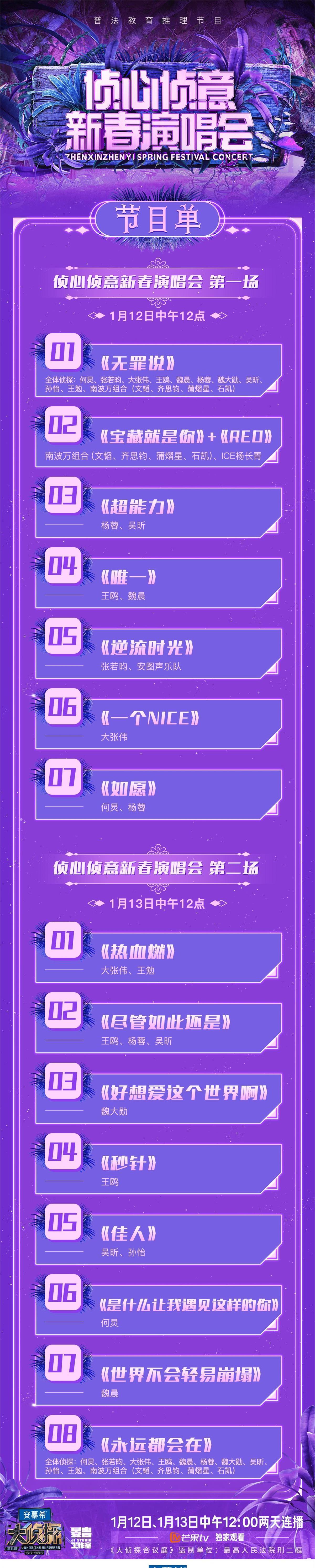 11日,节目官宣嘉宾阵容及演唱会节目单,并宣布何炅、张若昀、大张伟、王鸥、魏晨、杨蓉、魏大勋、吴昕、王勉和南波万组合回归齐聚新春演唱会,他们不仅合作演绎全新的舞台,还将送上诚意满满的新春福利,另外,ice杨长青、安图声乐队也将作为助阵嘉宾,与侦探们梦幻联动带来精彩表演。