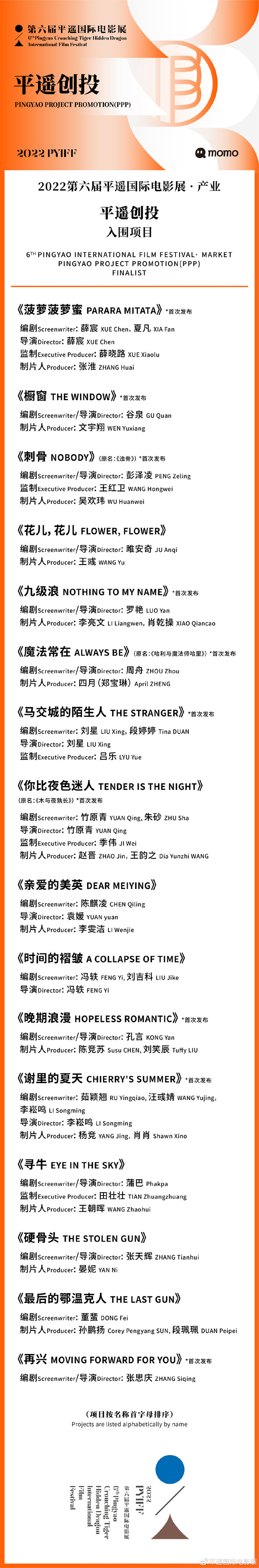 据悉,本届电影展产业板块常设单元“平遥创投”于2022年6月开始公开项目征集,经过报名及两轮初评审,16个剧本最终从772个报名剧本项目中脱颖而出,入围剧本涵盖家庭、女性、喜剧、悬疑、奇幻、儿童等多种类型题材。