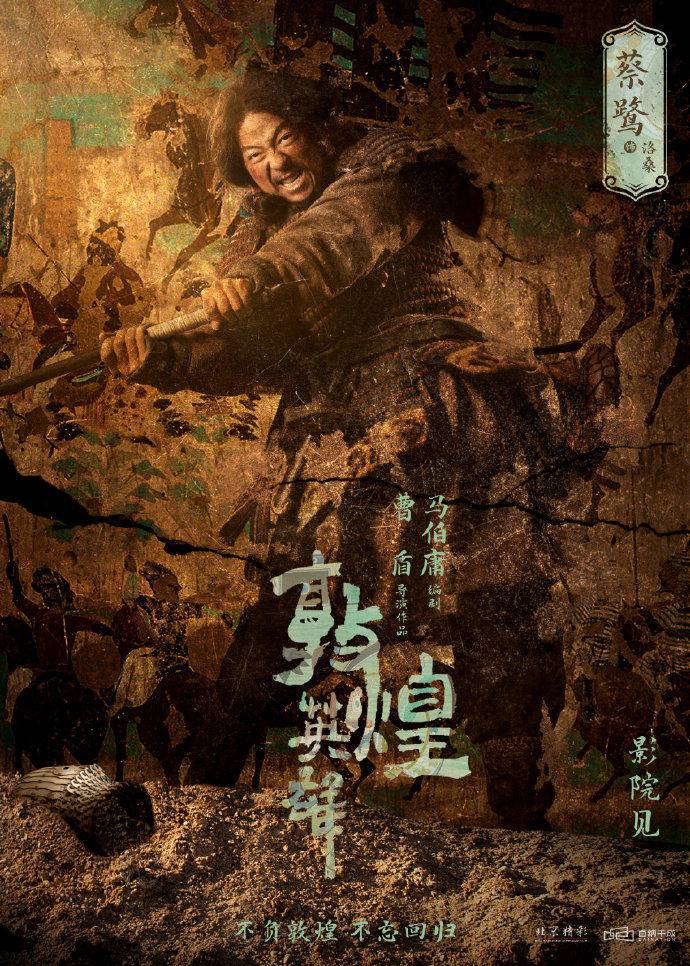 纵观岩壁之上,众角色或怒目而视、或横刀劈剑,展现了身处沙场的战争氛围。斑驳的岩彩纹理使壁画质感格外突出,独树一帜的“敦煌风”海报呈现出故事感。