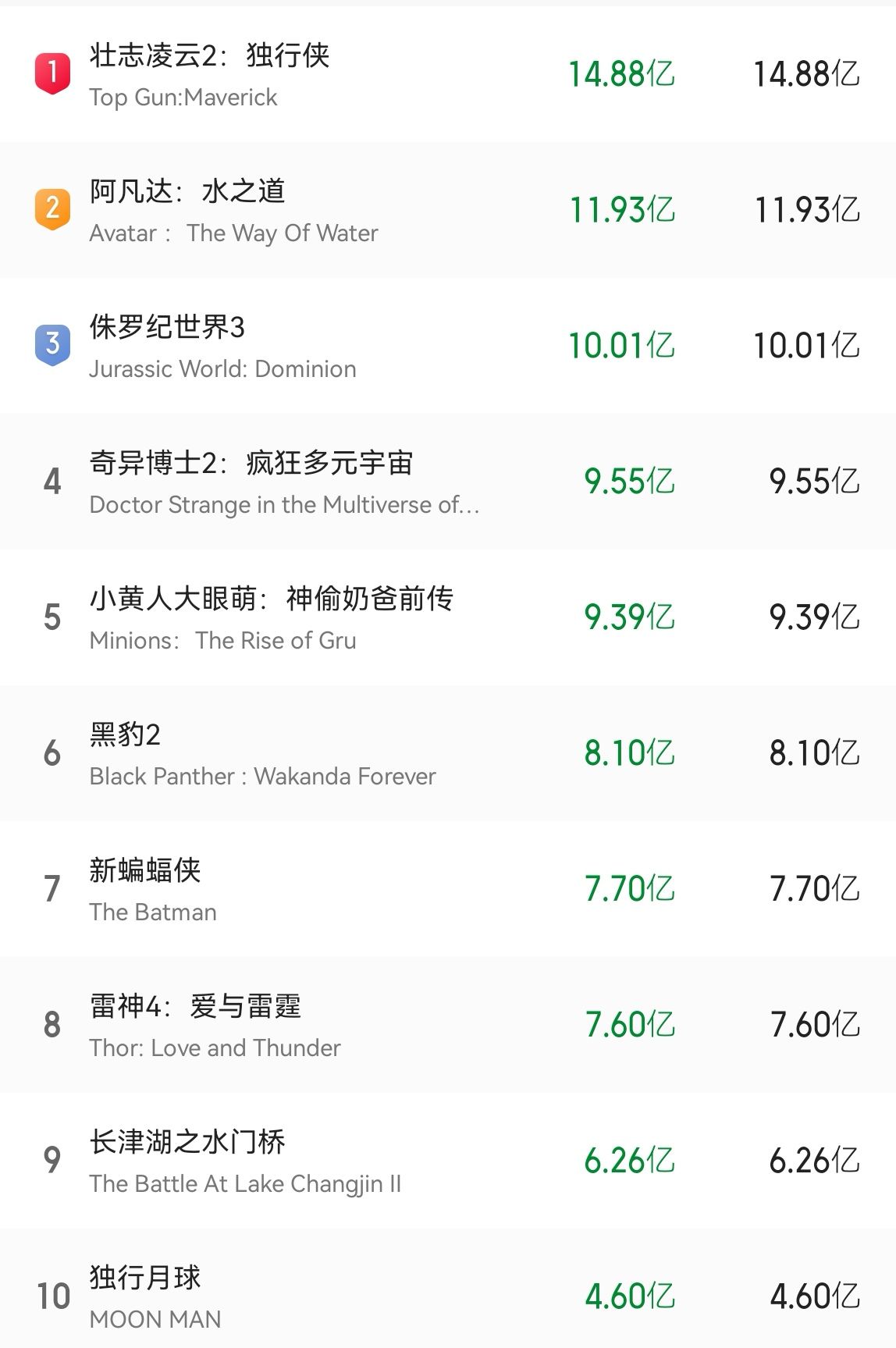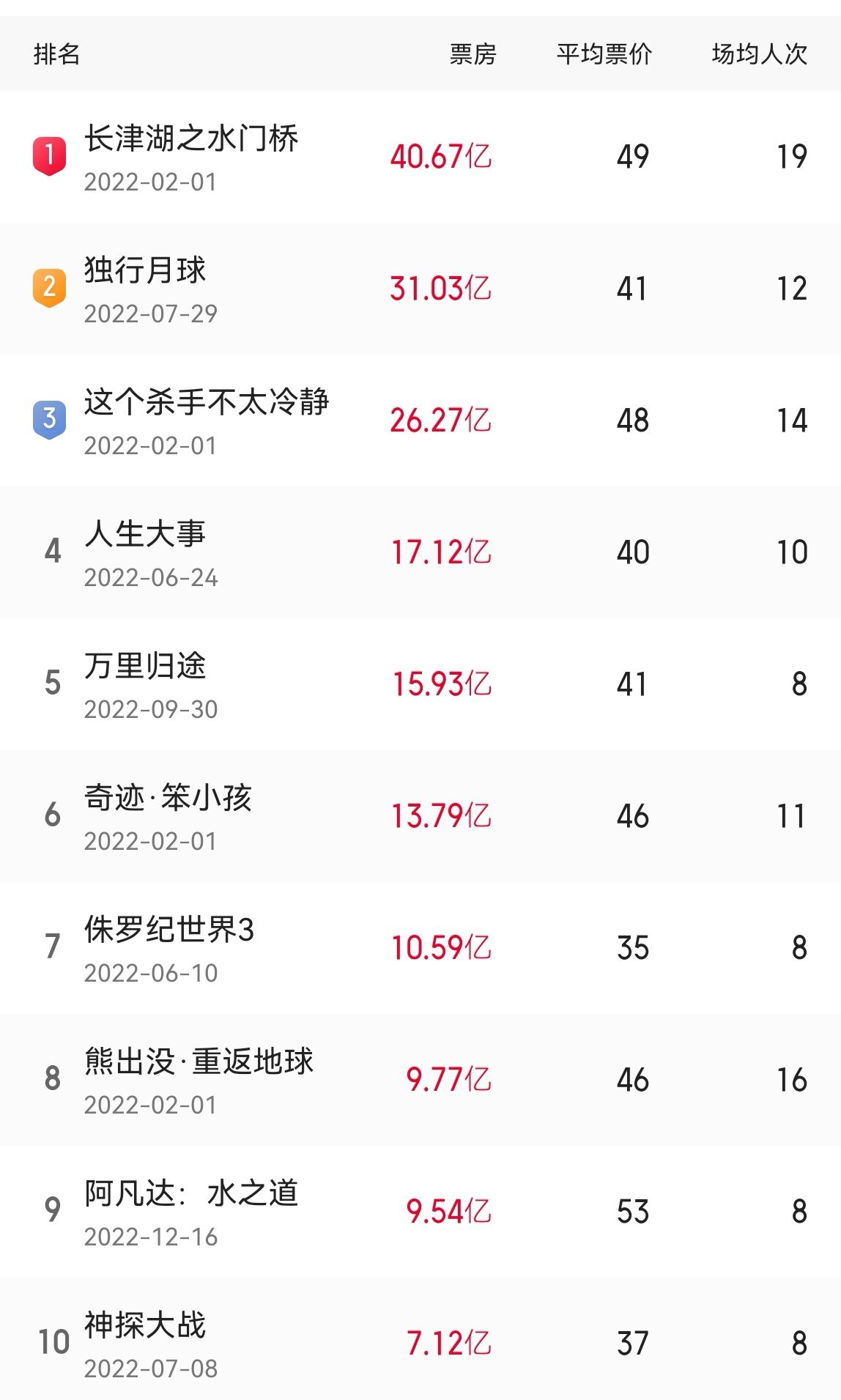 2022年,对全球电影行业来说,都不是容易的一年。中国内地年度票房卡点卖过300亿元博了个好彩头,但是这个数据,其实已经跌到2014年的年度票房数据。全球疫情,整个电影行业也在悄然转型,流媒体正在成为更多电影制作者看重的平台,疯狂增长的中国内地电影院,大部分都在等着兔年的春节档,因为看起来,没能在2022年的票面上击败阿汤哥的阿凡达,显然也没能让内地电影院舒缓多少。2022年,像头两年一样,不断有电影靠着内地票房就杀进全球年度票房前十名,今年的两部是《长津湖之水门桥》和《独行月球》,分列第九位和第十位。