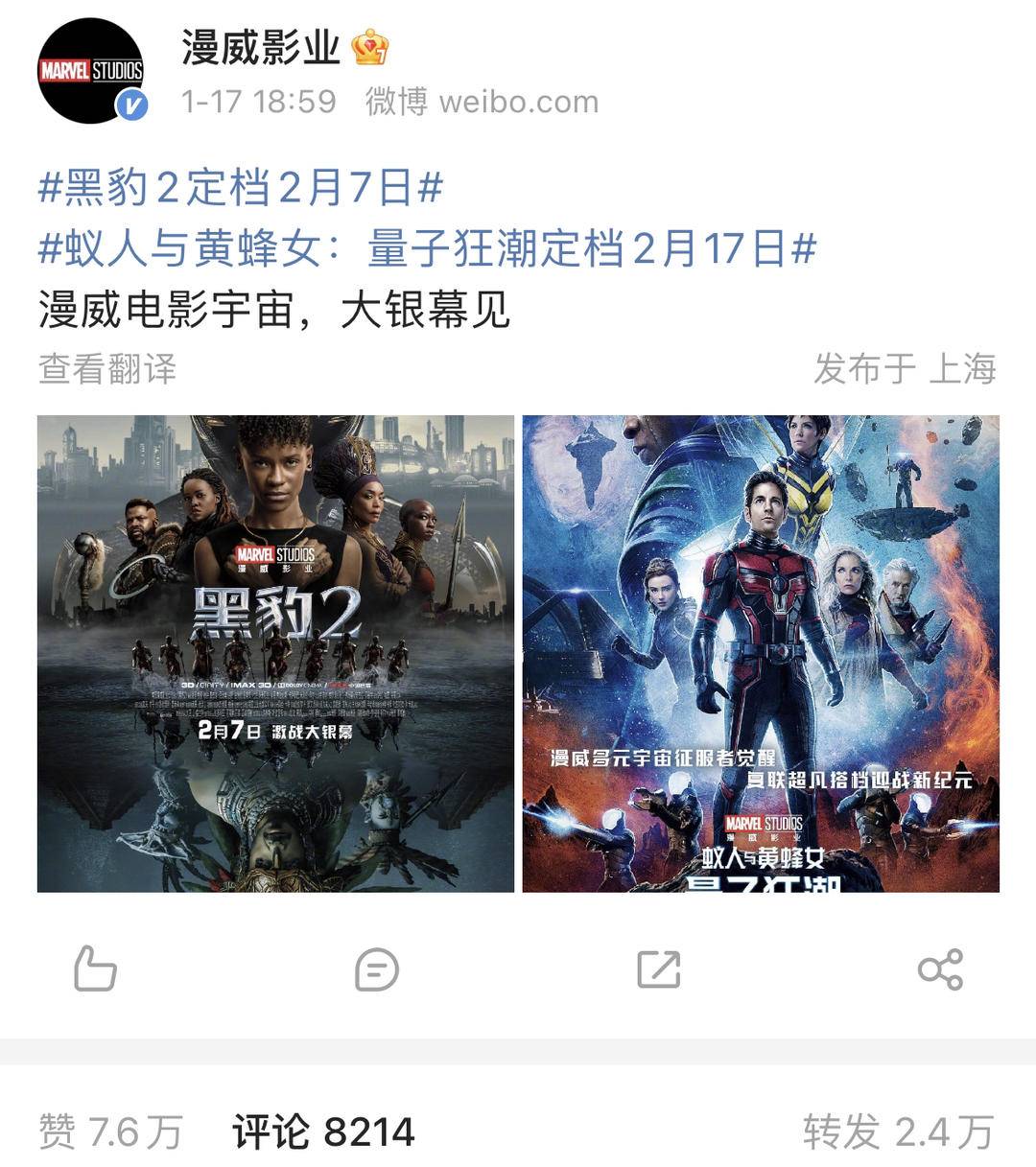 近日,漫威影业宣布《黑豹2》《蚁人与黄蜂女:量子狂潮》中国内地定档,《黑豹2》定档2月7日,《蚁人与黄蜂女:量子狂潮》2月17日与北美同步上映。加上DC宇宙的“雷霆沙赞”也将上映。不少影迷表示,时隔近4年,再次迎来超级英雄们。