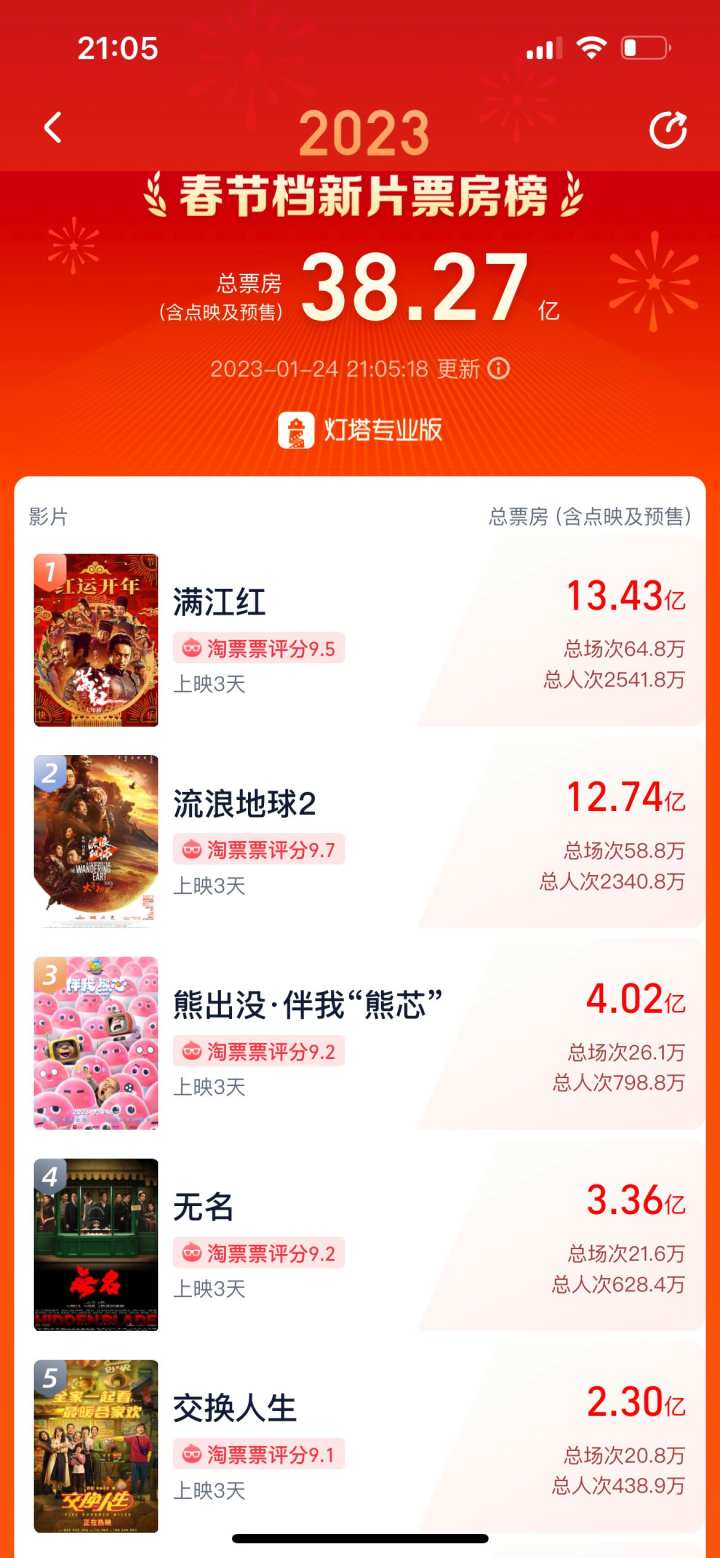 1月24日,史上口碑最好的春节档票房表现不错,当日票房再上10亿,并超过了去年大年初三。截止记者发稿时,春节档票房(含预售)已超38亿。
