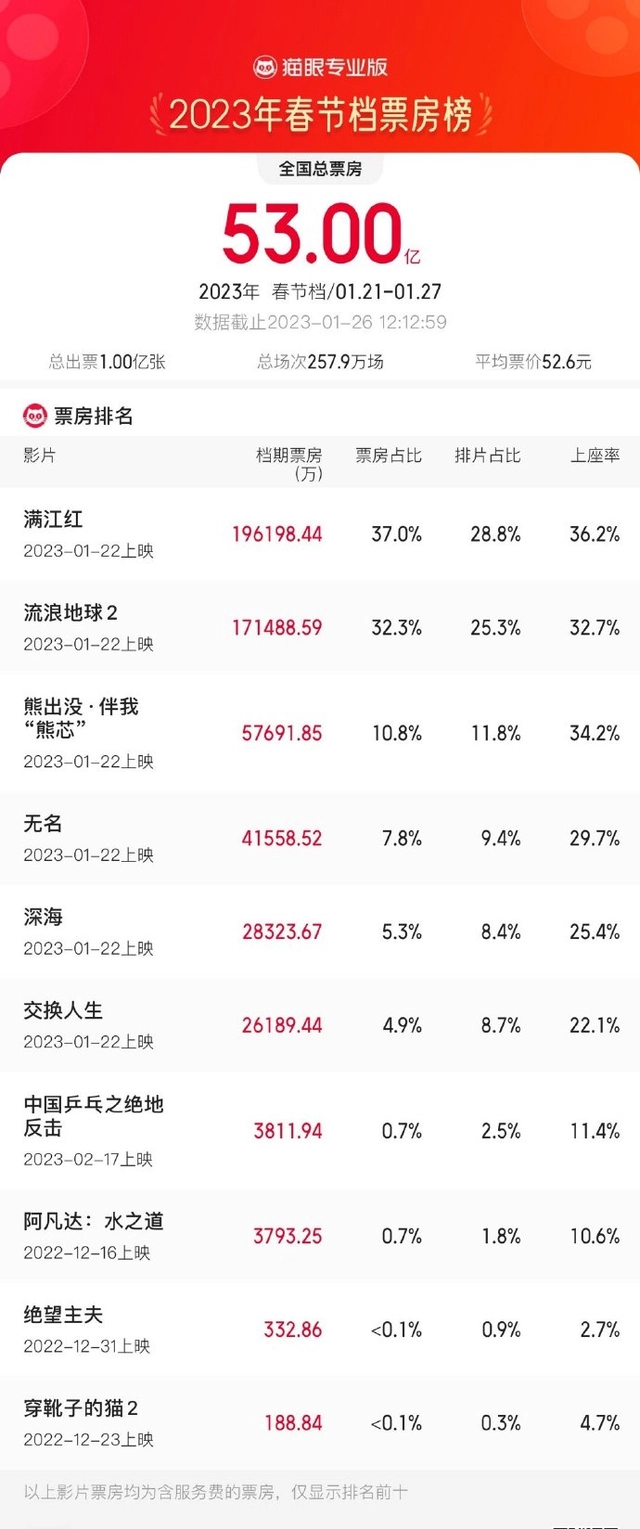 根据猫眼专业版数据显示,截至2023年1月26日12时12分,2023年春节档总票房(含预售)破53亿元。《满江红》《流浪地球2》《熊出没・伴我“熊芯”》分列春节档票房前三位。