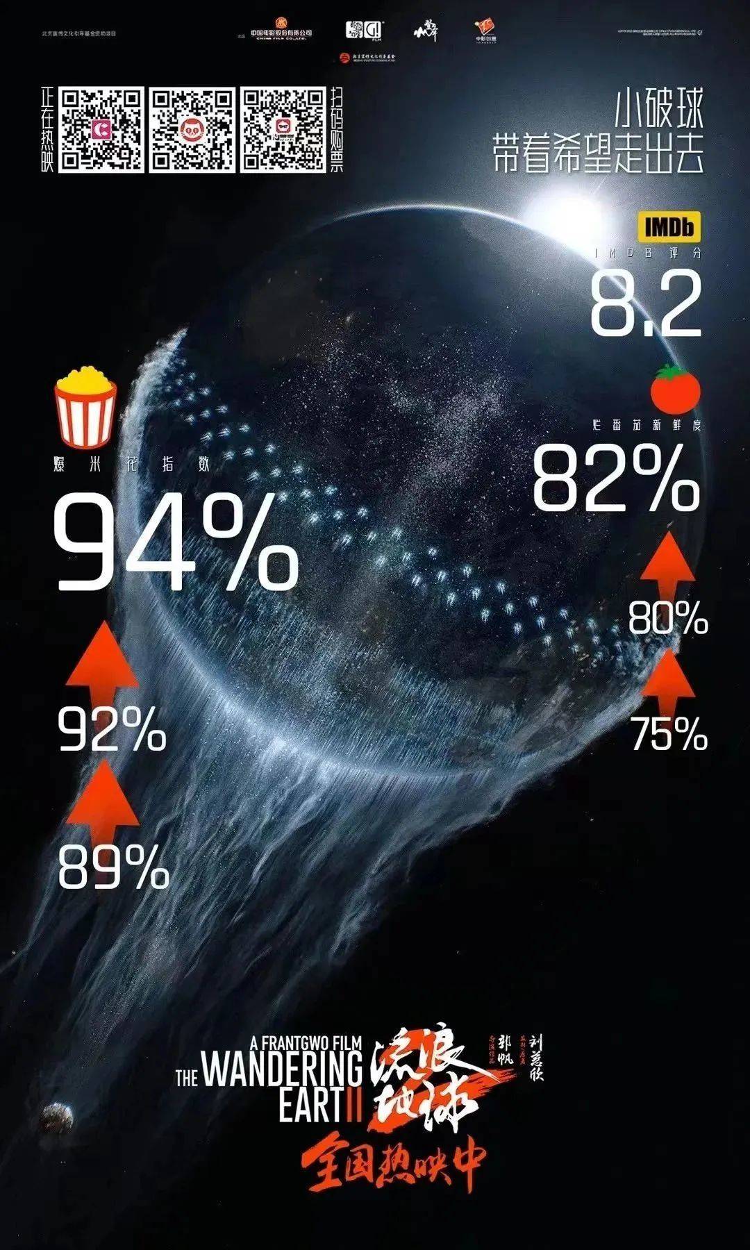 自海外上映以来,国外观众对《流浪地球2》的评价也是节节攀升,越来越高。爆米花指数从89%到92%再到94%;烂番茄好评度从最初的75%(8个评价),一路飙到83%(12个评价)。MTC从59分掉落到56分(8个评价)。