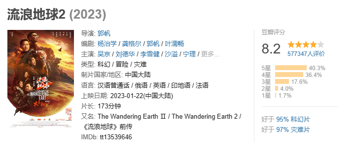 大象新闻消息,猫眼9.4分,淘票票评分9.7分,豆瓣电影评分8.2分,可以说,《流浪地球2》在口碑上取得了比前作更加优秀的成绩。