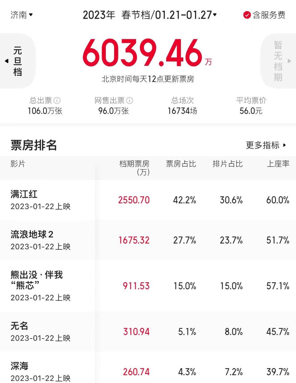 为期7天的2023电影春节档已经落下帷幕,假期期间,济南电影市场重现一票难求的景况。根据猫眼专业版显示,截至1月27日24时,济南春节档电影总场次达到16734场,票房累计6039.46万元,观影人次超过106万人,突破了百万大关。
