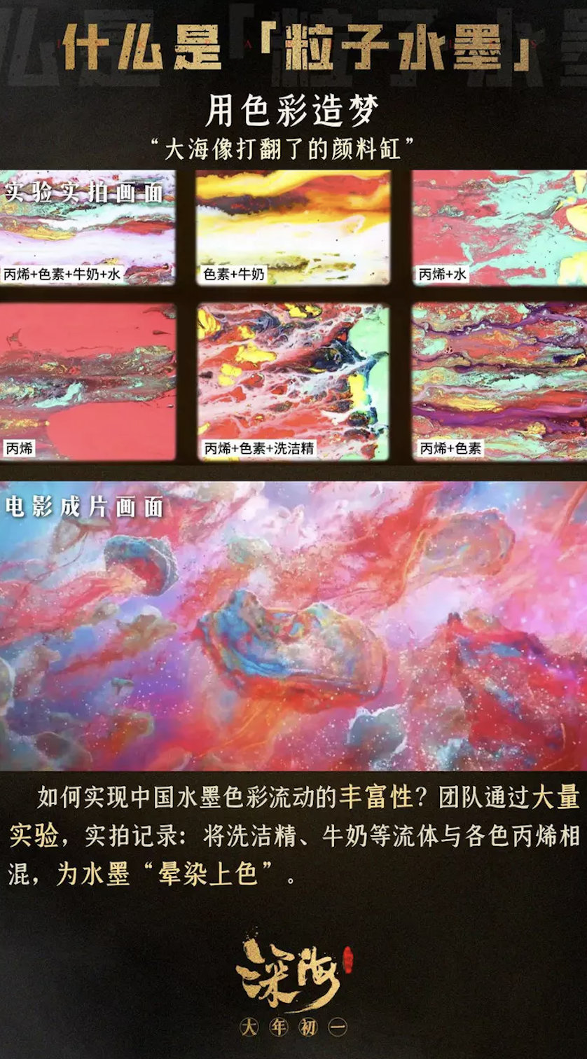 为了将写实具象的三维CG动画和写意留白的中国水墨画结合,《深海》的创作团队尝试过各种摸索试验,用洗洁精、丙烯、食用色素、牛奶混合,以模拟水墨的色彩流动,后来又推翻重来,尝试以无数粒子堆积成水墨的形态,打破三维物体的硬轮廓,以此还原水墨画的飘逸与颗粒感。