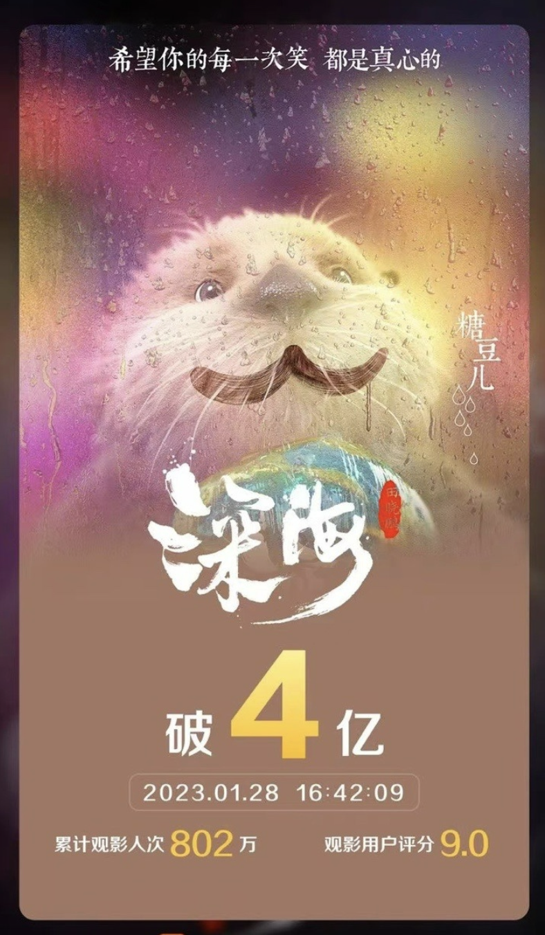 据灯塔专业版实时数据,截至1月28日16时42分,电影《深海》票房突破4亿。近日,《深海》导演田晓鹏在直播中答观众问,他表示《深海》的一切研究成果会共享。