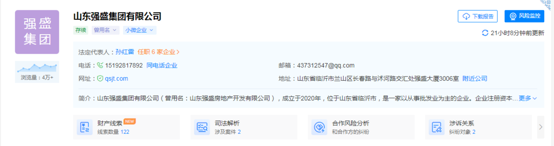记者在天眼查中发现,国内有不少名为“强盛集团”的公司,引发网友关注的是“强盛集团”是位于山东省临沂市的山东强盛集团有限公司,成立于2020年1月20日,曾用名为山东强生房地产开发有限公司,是一家从事批发业为主的企业。法人代表孙红雷为该公司的执行董事兼总经理,投资比例99%。在天眼查中,可以查到的名为“孙红雷”的老板有153位,其中演员孙红雷任职有11家企业,大多为各类影视传媒公司和影视文化工作室,与山东强盛集团并无商业关联。演员孙红雷对此事未有回应。