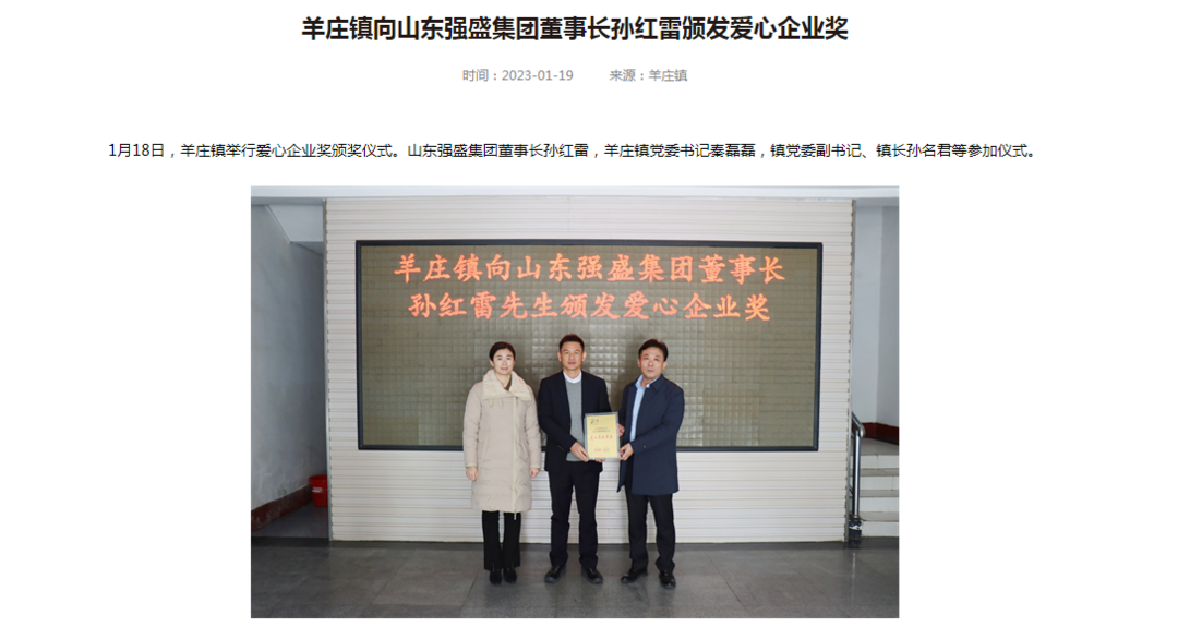 这难道是“梦幻联动”了?29日,山东强盛集团对此做出回应,表示纯属巧合,公司法人孙红雷和演员孙红雷不是同一个人,只是碰巧重名了。根据滕州市人民政府网,在今年1月19日,羊庄镇向山东强盛集团董事长孙红雷颁发爱心企业奖,据报道介绍,孙红雷是羊庄镇前沙冯村人,长期在临沂经商,从事大型酒店、房地产开发、海鲜批发等业务,先后创办了临沂华东国际水产城、山东名邸置业有限公司、山东强盛集团等企业,目前临沂华东国际水产城是临沂市最大的海鲜批发市场,其创办的千禧大酒店是临沂市4星级酒店。孙红雷先后为自己的家乡羊庄镇捐资200余万元,为羊庄镇振兴工作做出了巨大贡献。