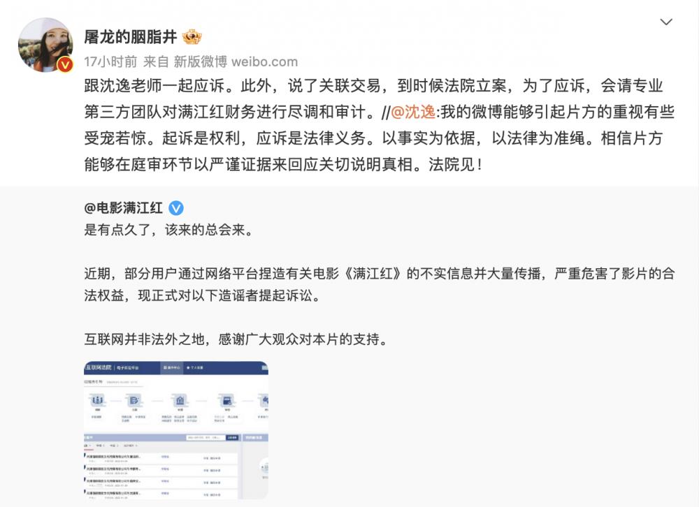 上游新闻记者注意到,《满江红》官博并未提到是否已将新浪微博所属的北京微梦创科网络技术有限公司列入起诉状中。