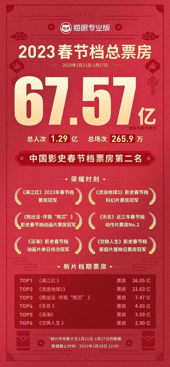 据猫眼专业版显示,截至2023年1月28日0点,2023年春节档总票房已达67.57亿,票房成绩仅次于2021年春节档,位居春节影史票房榜第2名,七部佳片助推电影业实现开门红。票房取得优异成绩的同时,也取得了众多观众的好评,在多个短视频及社交平台电影《满江红》多次冲上热榜第一,#背诵满江红、#看完满江红的后遗症、#学满江红走路等成为网友的讨论话题和挑战主题。