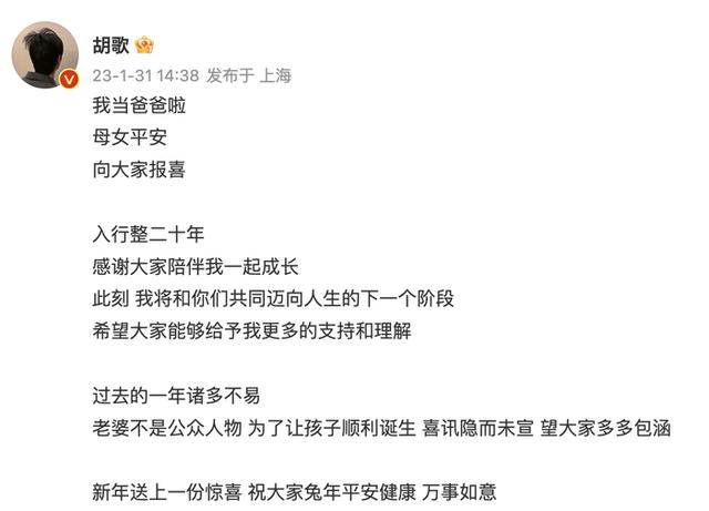 1月31日,胡歌官宣已婚当爸,母女平安,老婆不是公众人物,瞬间引爆热搜。