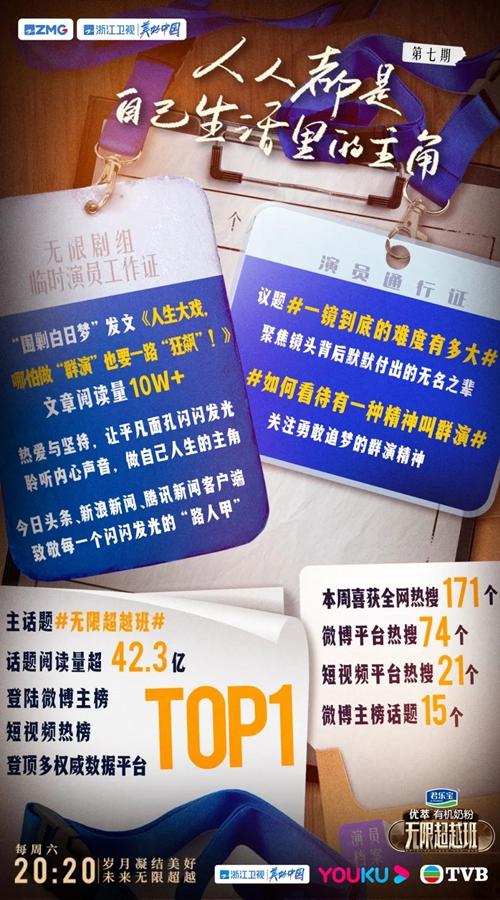 超越班艺员们在横店摸爬滚打,也让观众们仿佛看到了那个平凡却倔强的自己,本期节目全平台斩获热搜171个,其中微博热搜74个,主榜话题15个,登顶微博主榜及短视频榜单。截至目前,节目微博主话题#无限超越班#阅读量已超42.3亿,议题#一镜到底的难度有多大#、#如何看待有一种精神叫群演#引发网友热议,多权威数据平台持续登顶TOP1。