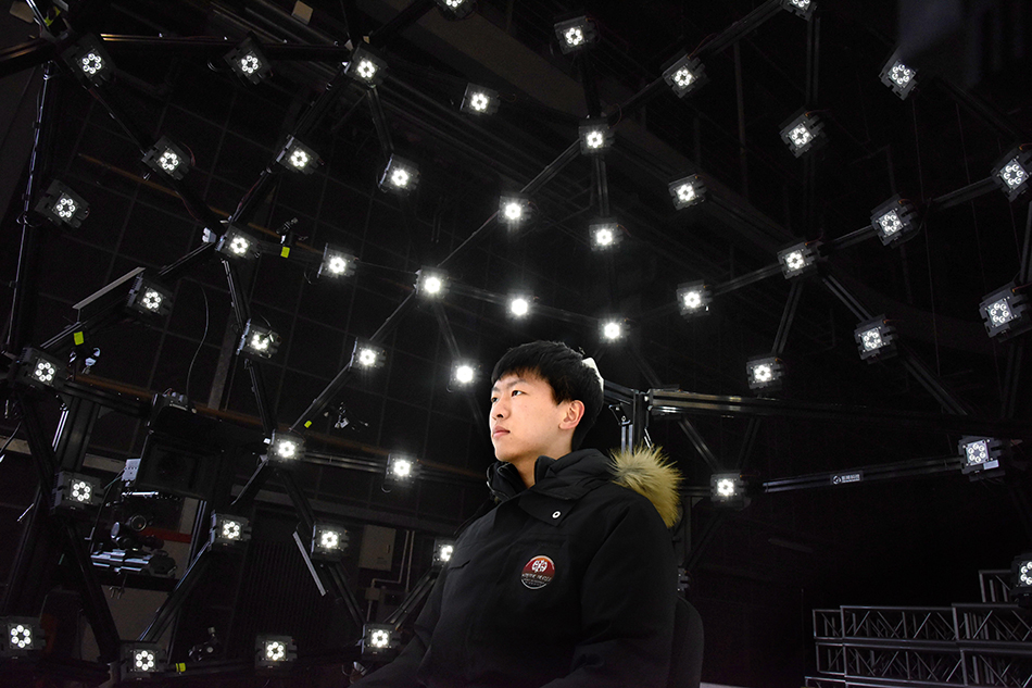 2023年2月8日,青岛东方影都影视产业园工作人员在介绍微表情捕捉技术。