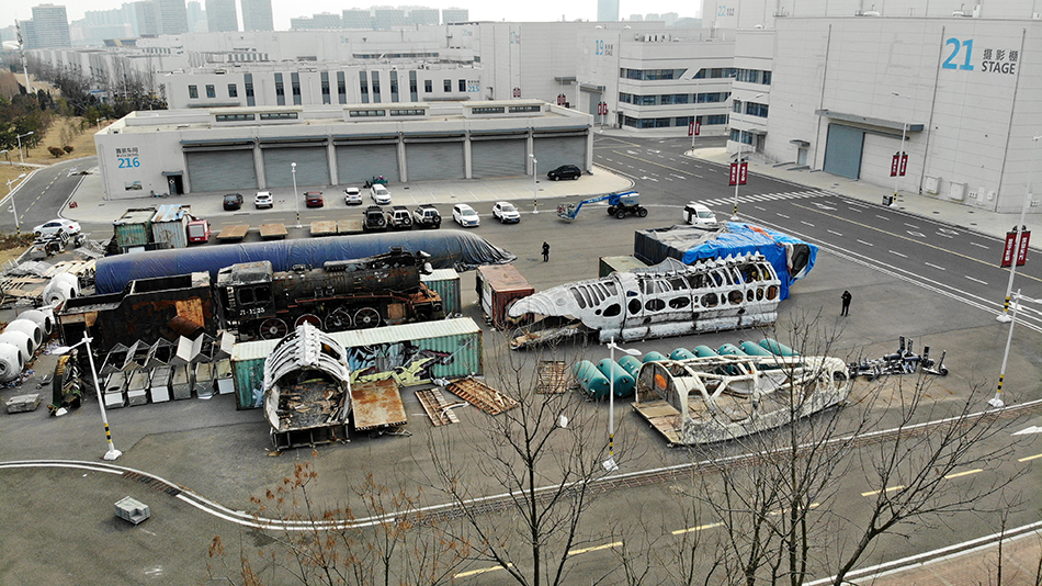 2023年2月8日,青岛东方影都影视产业园置景车间外堆放的部分影视道具。