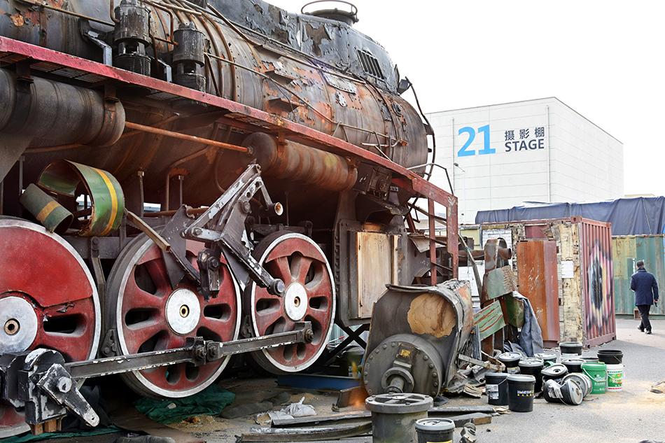 2023年2月8日,青岛东方影都影视产业园置景车间外的一个道具火车头。