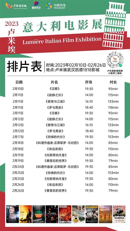据悉,“2023意大利电影展”武汉站放映活动将在卢米埃武汉凯德1818影城举办,对意大利影片情有独钟的影迷可以根据排片表选择自己的心头爱。