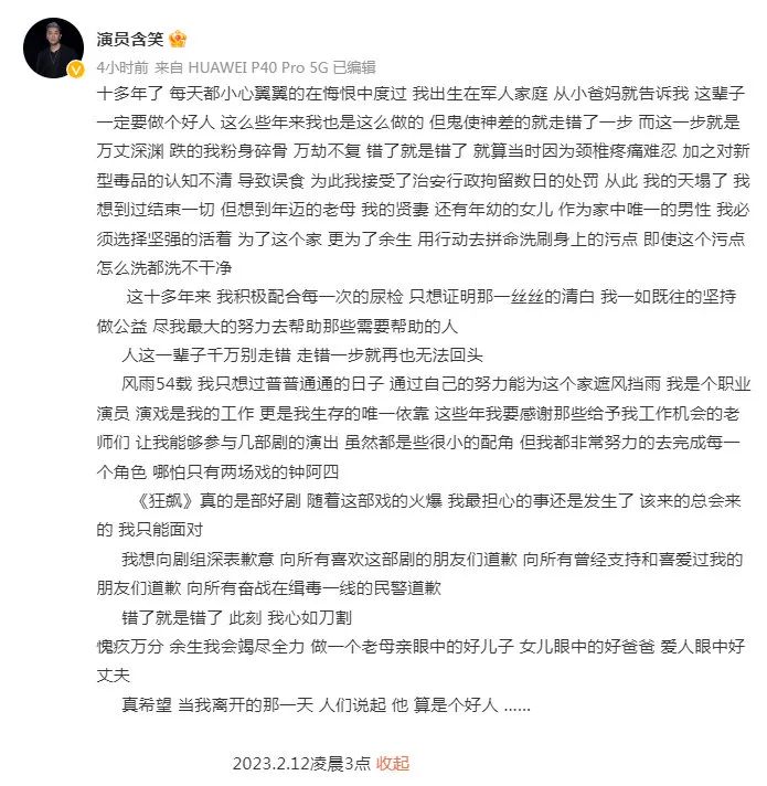 12日凌晨,被指曾涉毒的演员含笑发文表示,向剧组深表歉意,向所有喜欢这部剧的朋友们道歉,向所有曾经支持和喜爱过我的朋友们道歉,向所有奋战在缉毒一线的民警道歉。