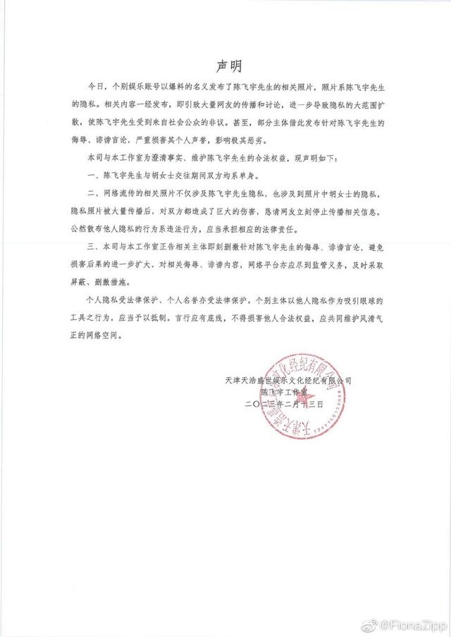 陈飞宇回应被曝私密照:交往期间双方均系单身