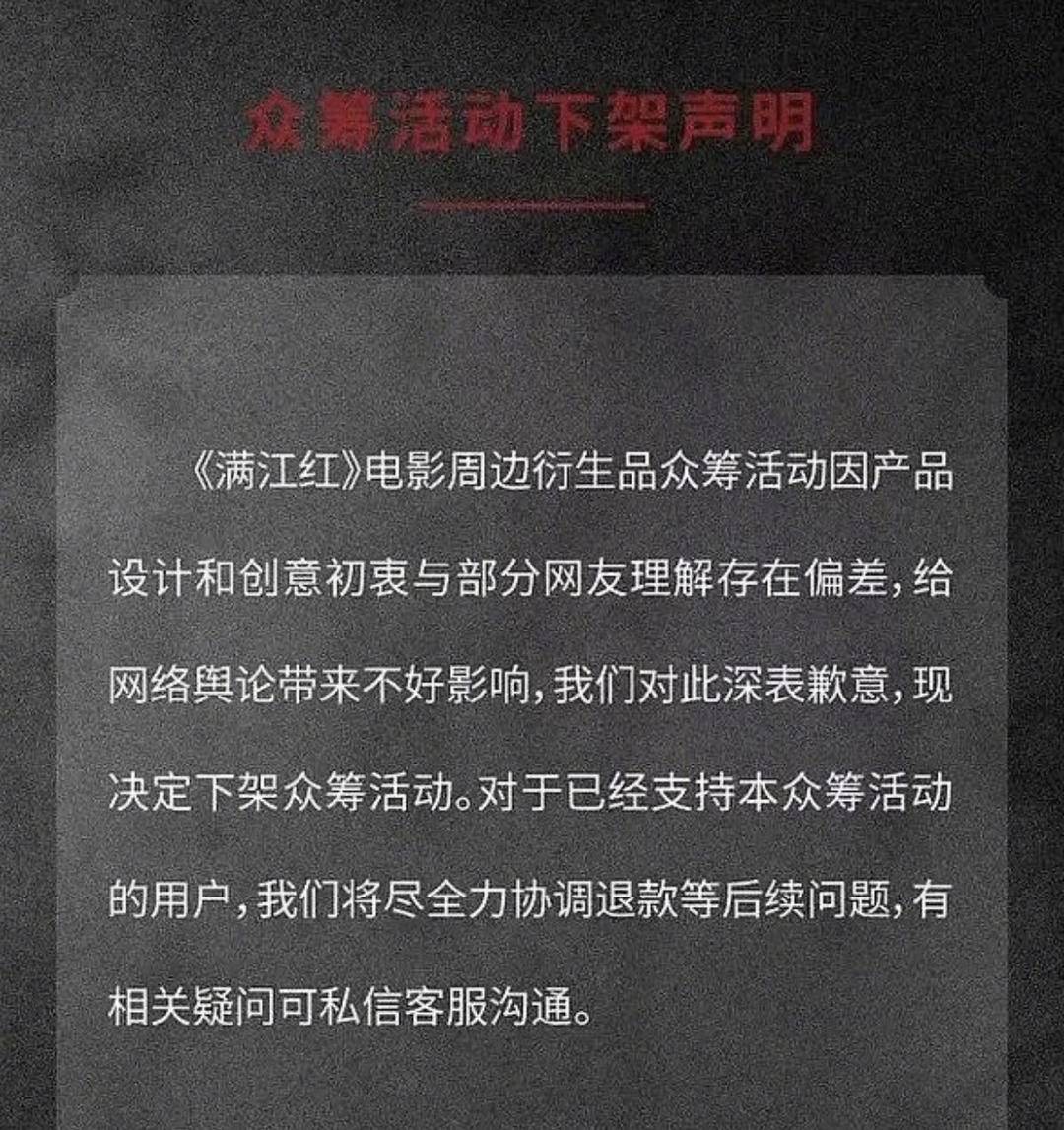 随后,官方发布声明表示:“《满江红》电影周边衍生品众筹活动因产品设计和创意初衷与部分网友理解存在偏差,给网络舆论带来不好影响,我们对此深表歉意,现决定下架众筹活动。对于已经支持本众筹活动的用户,我们将尽全力协调退款等后续问题,有相关疑问可私信客服沟通。”