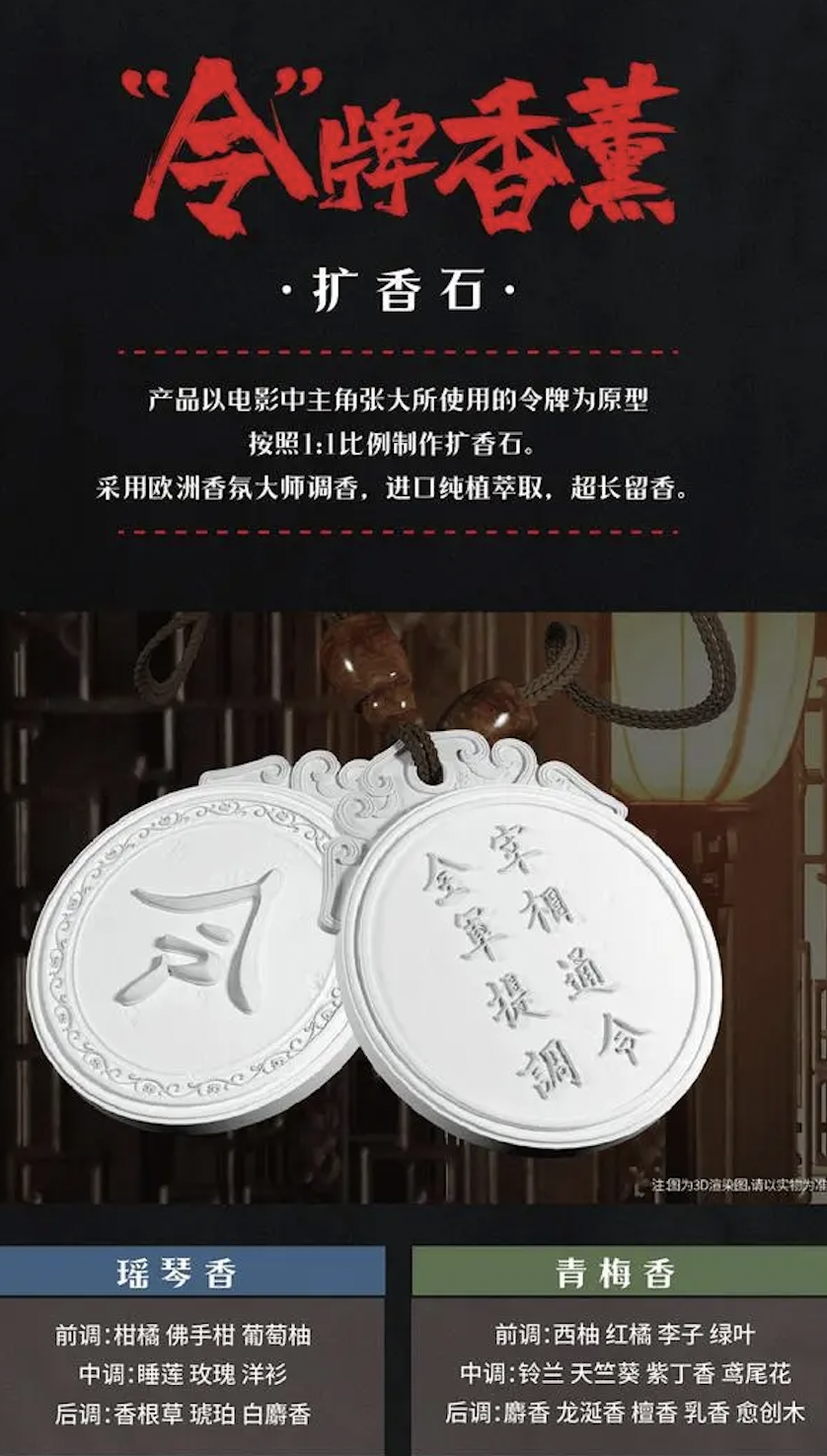 其中,“令”牌香薰扩香石,是以电影中主角张大所使用的令牌为原型,按照1:1比例制作的,但上面写有“宰相通令,全军提调”的字样,在影片中,也是秦桧赐给张大查案的信物。因此,有网友质疑:“这是在卖秦桧周边?”