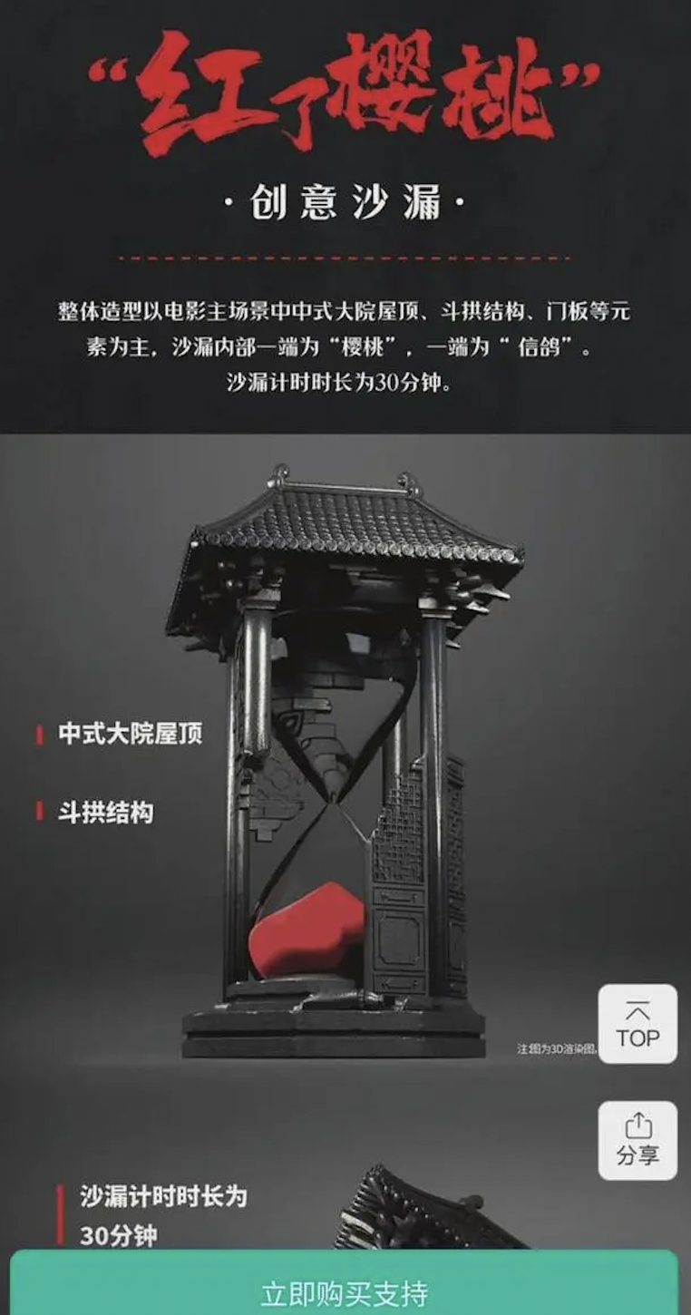 以电影场景中的中式大院元素设计的“红了樱桃”创意沙漏,其造型也被网友认为容易让人联想到岳飞被冤死的“风波亭”。另外,还有网友指出,解锁福利竟然有萌版秦桧的书签,“这不是在萌化秦桧吗?!”
