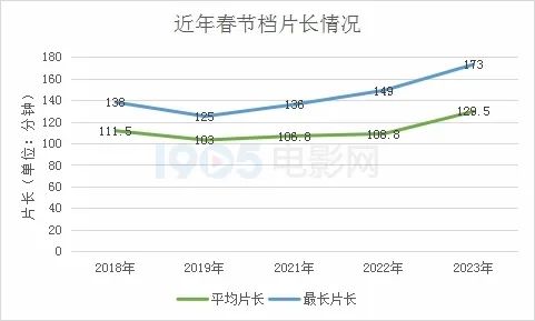 只不过这里的“最长”,并非单纯用来形容2023春节档的“后劲”,从客观数据上看,今年的这些影片还在单片长度上大幅提升了过往的平均数据: