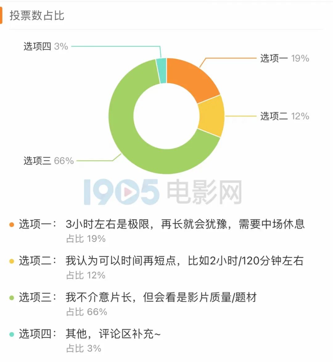 为了解观众对“超长”影片的态度,日前我们也在1905电影网官博发起投票。参与投票的网友中,近2成表示3小时影片是自己的“极限”,如果片长再继续增加,可能会在购票时有所顾虑,或者需要设置“中场休息”时间;12%的观众认为院线电影的篇幅还可以再适当压缩,比如120分钟之内比较适合。