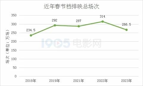 2023年春节档票房最终报收超67.5亿,同比增长超10%,观影人次也以1.29亿力压去年同期。而与此相对应的,是排片场次总数的下降:2022年,春节档期间排映总场次达到314万场,而今年,这一数据则为266.5万。
