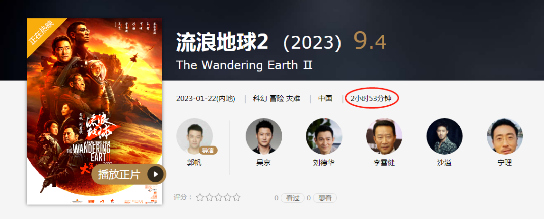 目前仍在单日票房榜领跑的《流浪地球2》,单片时长达到173分钟,不仅比前作增加了48分钟,也成为近年同档期片长之最。难怪影片热映期间,最热门和实用的观影指南会是:如果一定一定要去洗手间,刘培强削苹果是你唯一机会。