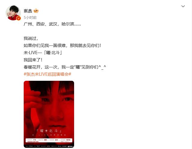 17日,歌手张杰也在微博官宣巡回演唱会的消息,他写道:“如果你们见我一面很难,那我就去见你们!”海报上,除了已经公布的4个城市外,还有一行小字“更多城市,comingsoon……”,预示着接下来还会有更多的见面机会。