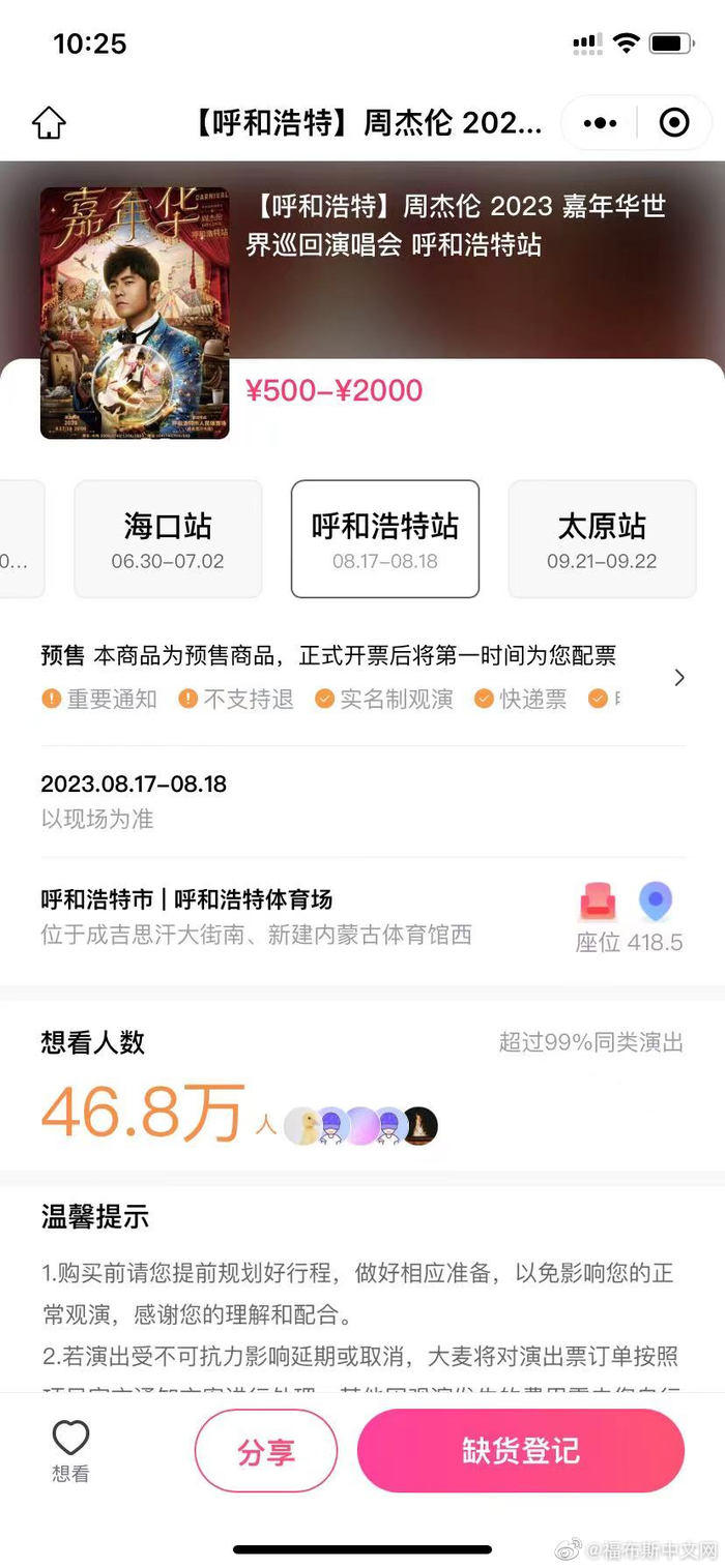 不过,17点18分、17点58分,8月17日和8月18日呼和浩特站的两场演唱会正常售票。与太原站类似,开售不到30秒,两场演唱会均已无票。