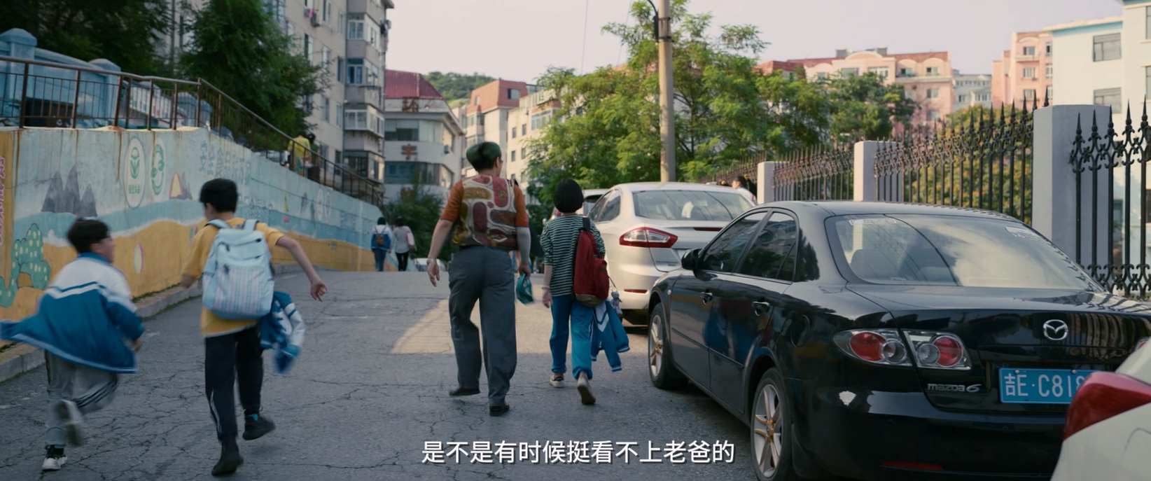 《保你平安》剧照。魏平安接女儿放学。